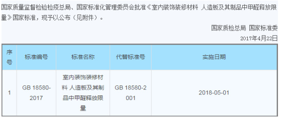 根據2017年4月22日中華人民共和國國家標準公告(2017年第9號)“關于批準發布《室內裝飾裝修材料 人造板及其制品中甲醛釋放限量》國家標準的公告”,由全國人造板標準化技術委員會歸口管理的《室內裝飾裝修材料 人造板及其制品中甲醛釋放限量GB 18580-2017》國家強制性標準正式頒布,并于2018年5月1日開始實施。