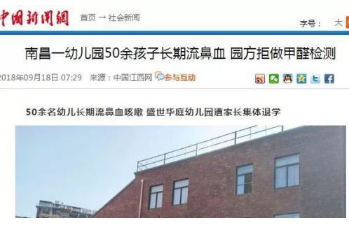 據(jù)中國新聞網(wǎng)報(bào)道, 9月17日,剛剛開學(xué)不久,由香港YM教育集團(tuán)投資創(chuàng)辦的南昌經(jīng)開區(qū)奧克斯盛世華庭幼兒園遭到家長集體退學(xué)。家長們告訴記者,該幼兒園園開學(xué)一年來,已有50名幼兒頻繁流鼻血、咳嗽。家長們都懷疑是學(xué)校甲醛超標(biāo)引起的,但是園方卻拒不配合檢測,且處理態(tài)度十分惡劣。出于對孩子健康的擔(dān)憂,幾十名家長不得不讓孩子退學(xué)。