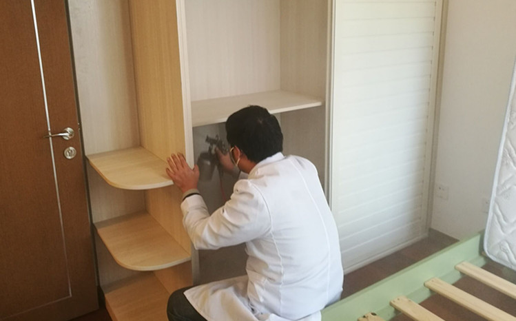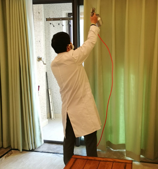 使用藥劑及施工方案: 主要藥劑有甲醛消除劑、納米光觸媒。根據這套房子室內裝修情況,對于集中定做的柜子和抽屜,我公司施工人員使用甲醛清除劑對柜子和抽屜進行全面噴灑,重點治理,施工時保證全面均勻、不留死角,另外對墻面和沙發,坐墊窗簾等布飾使用光觸媒治理,在分解污染源的同時,增加光觸媒的受面,能分解游離的甲醛其他污染物,下面為施工現場照片:
