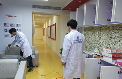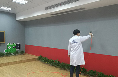 針對其空間結構特點、污染物種類、污染源頭,結合我公司多年的幼兒園、早教機構的治理經驗,針對易散發甲醛等有害物質的污染源,重點治理,對教師的辦公室辦公家具,因為板材較厚,不易滲透,我公司采用高溫熏蒸技術將甲醛清除劑強力滲透進板材內部,對粉刷的墻面,使用利純納米光觸媒,進行甲醛清除,這些地方光照量較充足,便于光觸媒對甲醛的分解,對于辦公家具、書桌、儲物柜、木門、地板等污染重災區,采用甲醛清除劑進行處理,且施工使用產品安全無毒,產品已通過國家權威部門安全無毒檢測。在每一遍施工中,我們不放過任何一個可能釋放甲醛的污染源頭,施工時輕拿輕放,施工后將所有物品回歸原位,良好的施工態度得到了相關負責人的肯定。